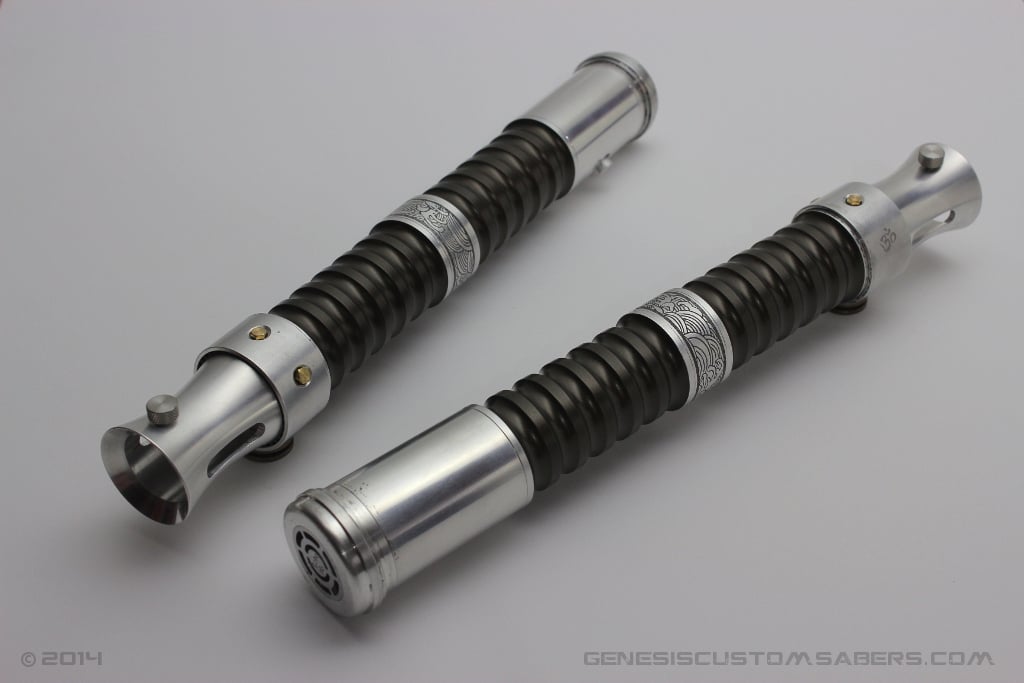 When I was commissioned by a client to create a joinable pair of sabers that reflected his own values and influences, this design began to emerge. The subtle curves, gentle weathering and etched pattern of water combine to form a balanced pair of duelling sabers that pack a real punch.