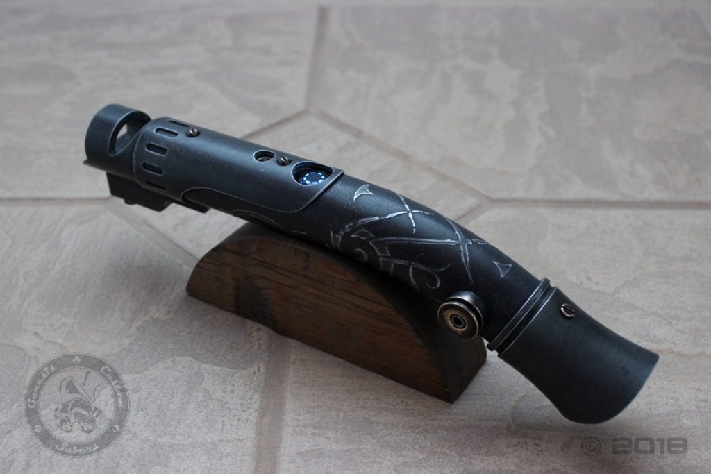 This saber has the Crystal Focus 4.5 from Plecter Labs. 3.7v internal battery pack, Plecter Pixel setup, aged brass screws, and blue illuminated switch. It’s available with my NPX-1 blade.