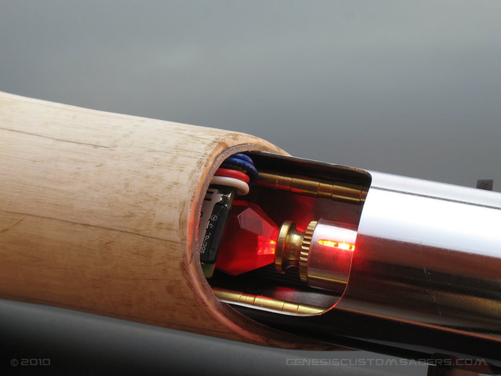 Finally, I wanted the inside of the hilt to contain as much design as the outside. I created a crystal chamber, with most of the wiring run through the brass tubes. I integrated the bargraph with this crystal chassis, and made an LED pattern that simulates energy pulses. The opening also serves as an access point for the Micro SD card.