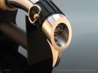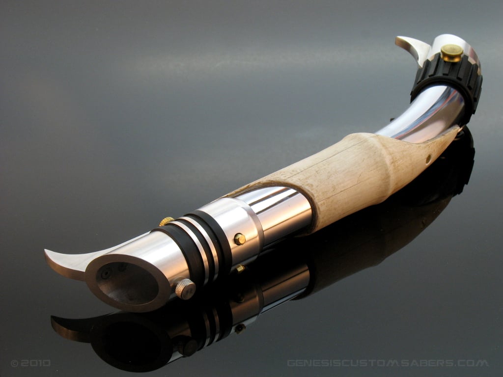 Finding a way to simulate bone gave me a great opportunity to meld ancient and refined imagery. I set to work designing this saber around a curved metal handle, and a bone central grip. A natural looking ridge in the bone marked the balance point between both hands for a two-handed grip style. I was not satisfied with the curve in the metal handle, the design on paper did not look “hooked” enough. The swept aluminum tips, first on the emitter, then on the pommel too, gave the saber more beautiful curved lines and a mean, almost fang-like profile.