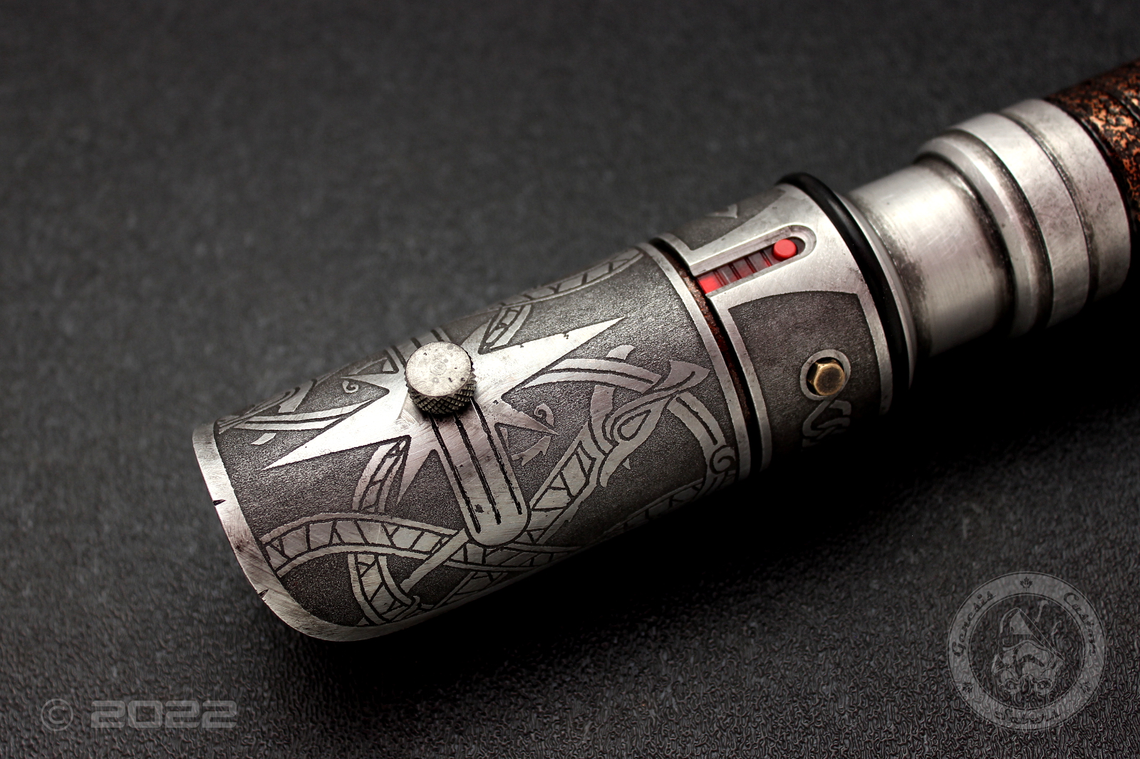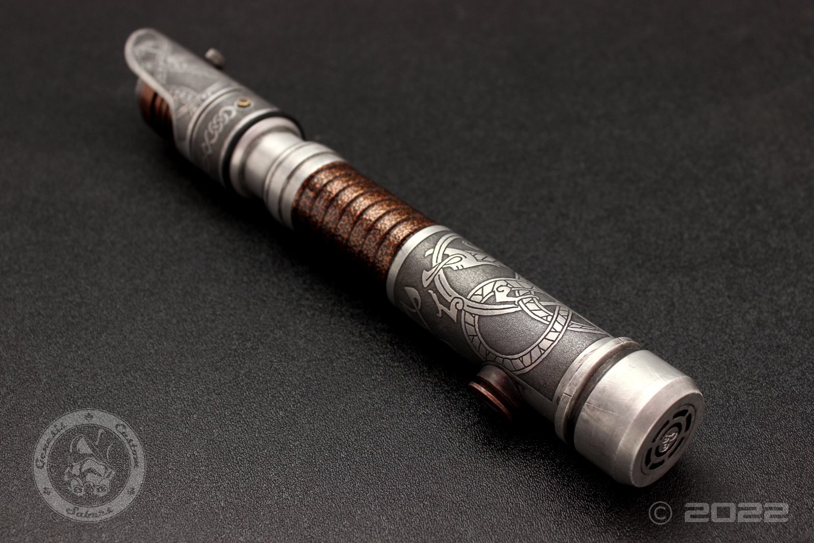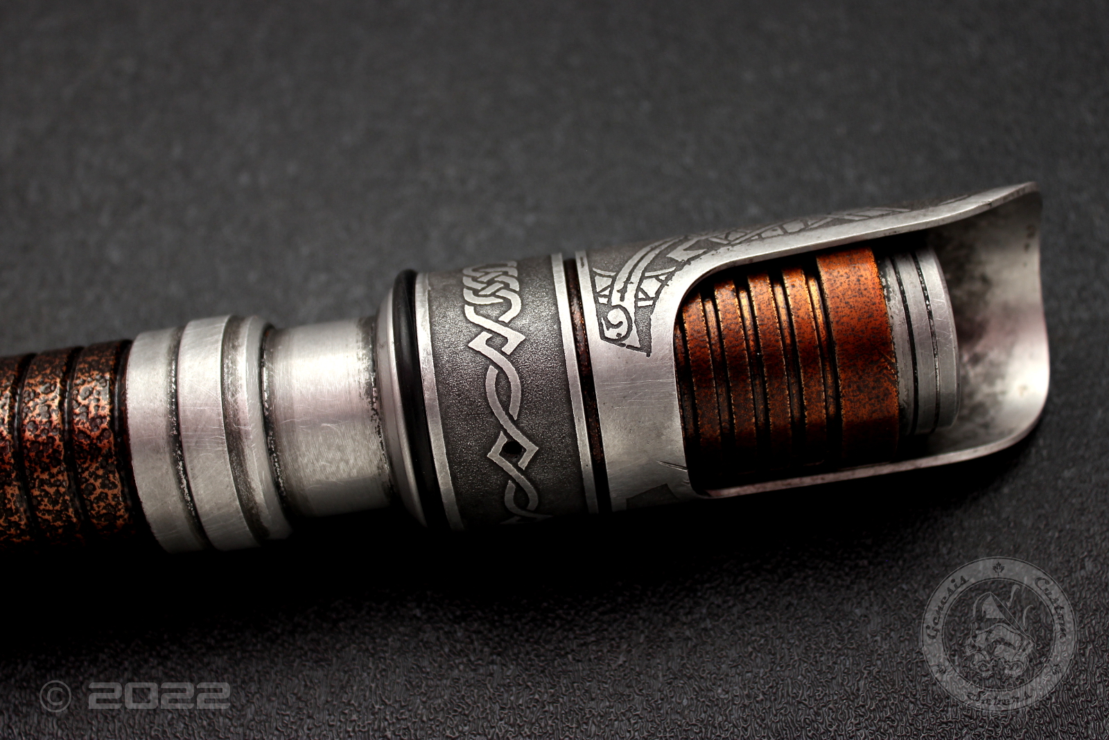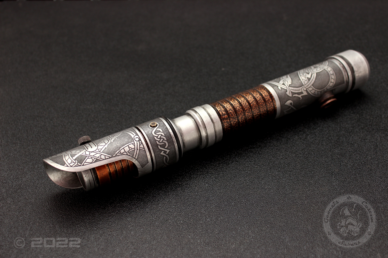 This shrouded custom Ascend features a new Norse design I drew up, showing two dragons locked in combat. It’s weathered and powdercoated with copper and red accents. I envisioned this saber being wielded by a Viking-like Jedi who tends toward confrontation. It’s weathered in a way which suggests lots of use on a variety of worlds.