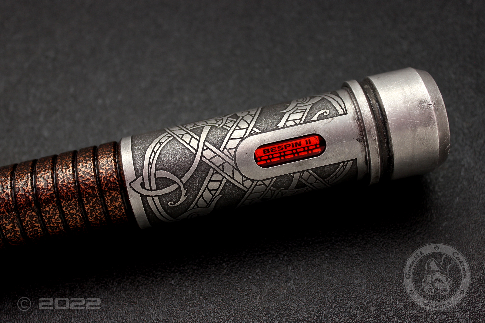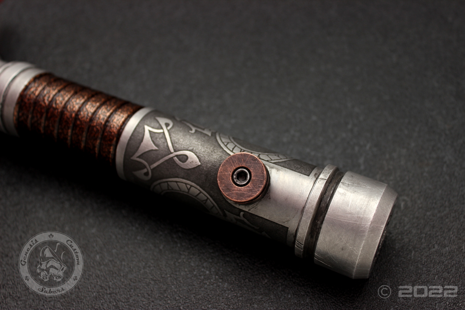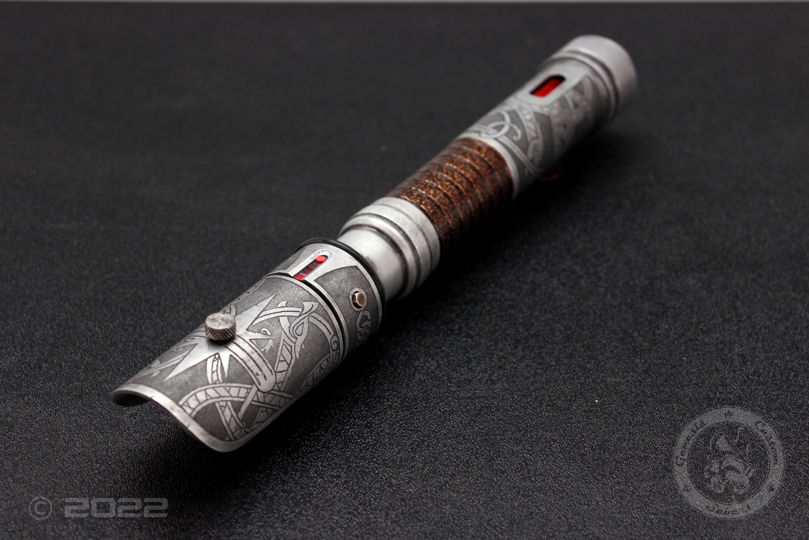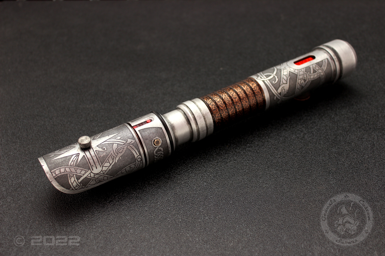 This shrouded custom Ascend features a new Norse design I drew up, showing two dragons locked in combat. It’s weathered and powdercoated with copper and red accents. I envisioned this saber being wielded by a Viking-like Jedi who tends toward confrontation. It’s weathered in a way which suggests lots of use on a variety of worlds.