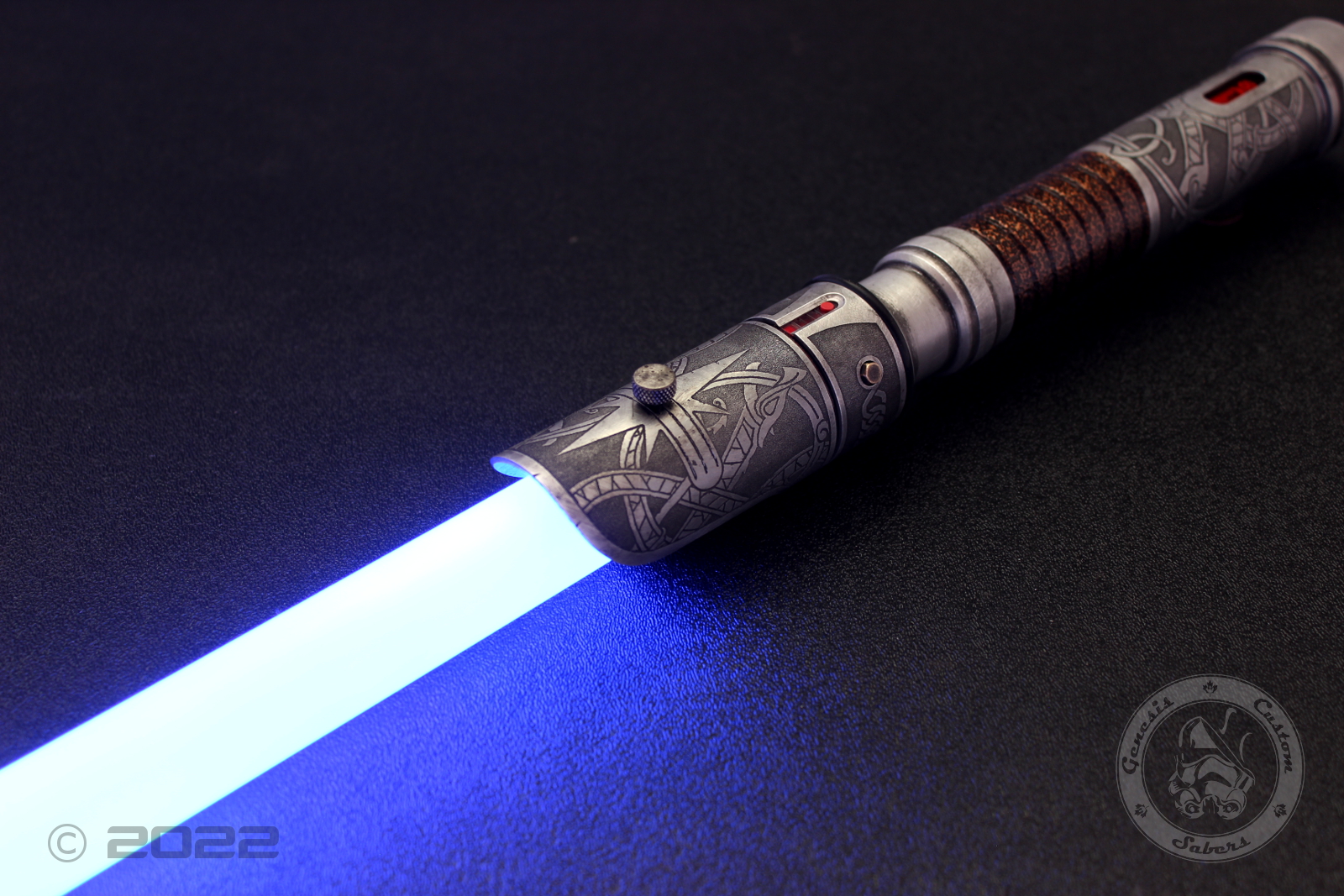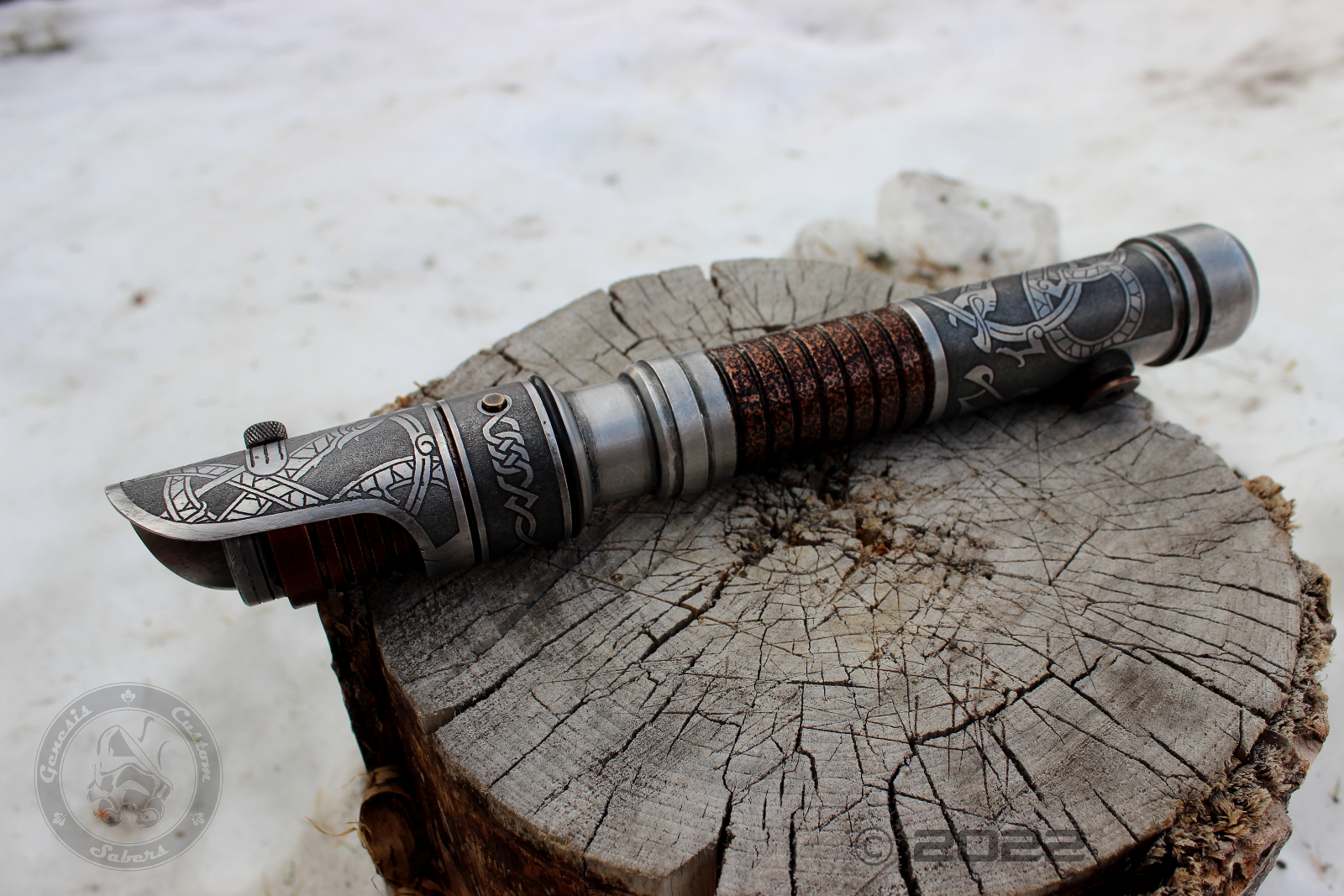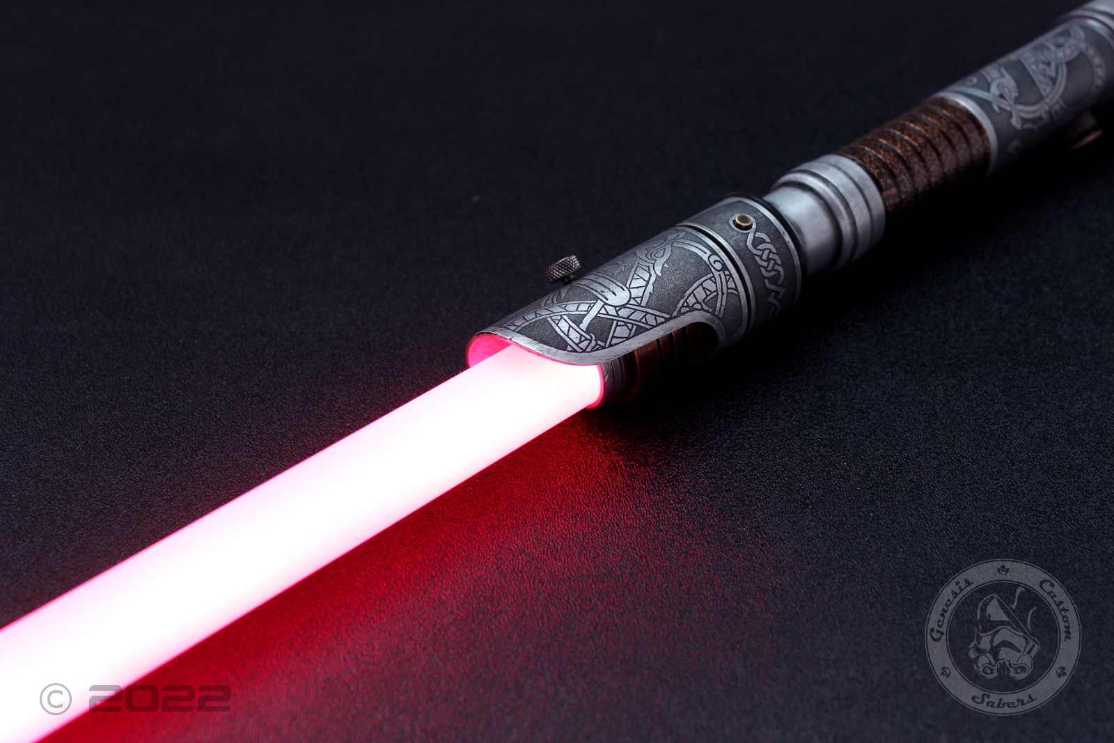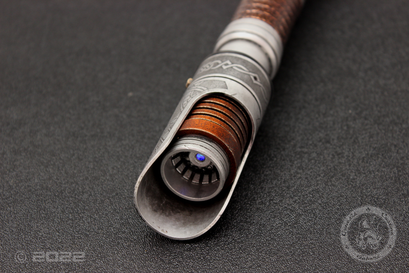 This shrouded custom Ascend features a new Norse design I drew up, showing two dragons locked in combat. It’s weathered and powdercoated with copper and red accents. I envisioned this saber being wielded by a Viking-like Jedi who tends toward confrontation. It’s weathered in a way which suggests lots of use on a variety of worlds.