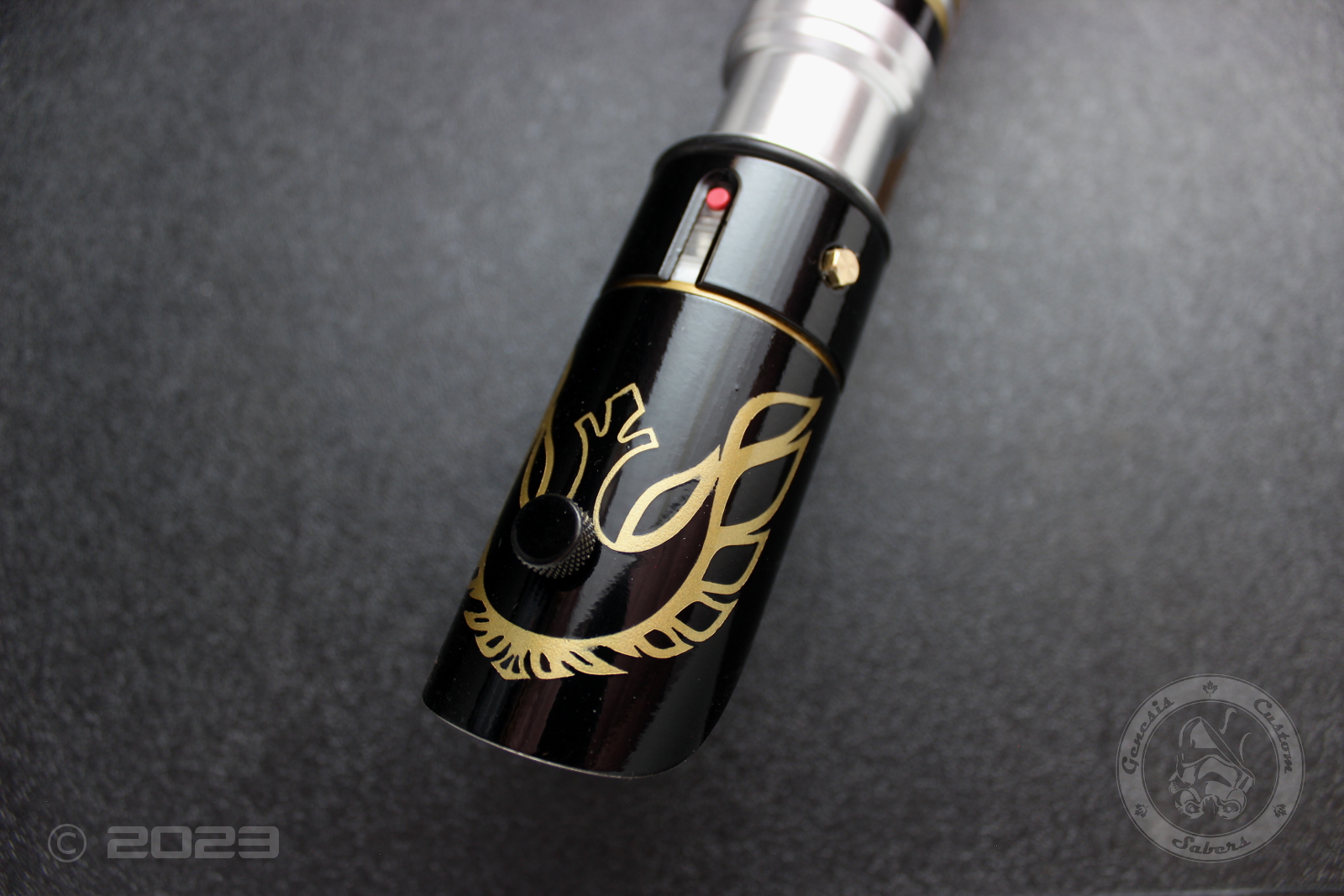 This saber is a departure from my norm in several ways. First off; it’s shiny, not weathered. I used a gloss black powdercoat, and automotive paint for the gold and clearcoat. The symbol is a paint stencil, not etching.